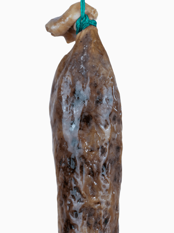 La tripa cular, más gruesa que otras, permite una maduración más prolongada y una mayor concentración de sabor, dando como resultado un salchichón de gran calidad, con aroma profundo, corte limpio y un equilibrio perfecto entre especias y grasa infiltrada.